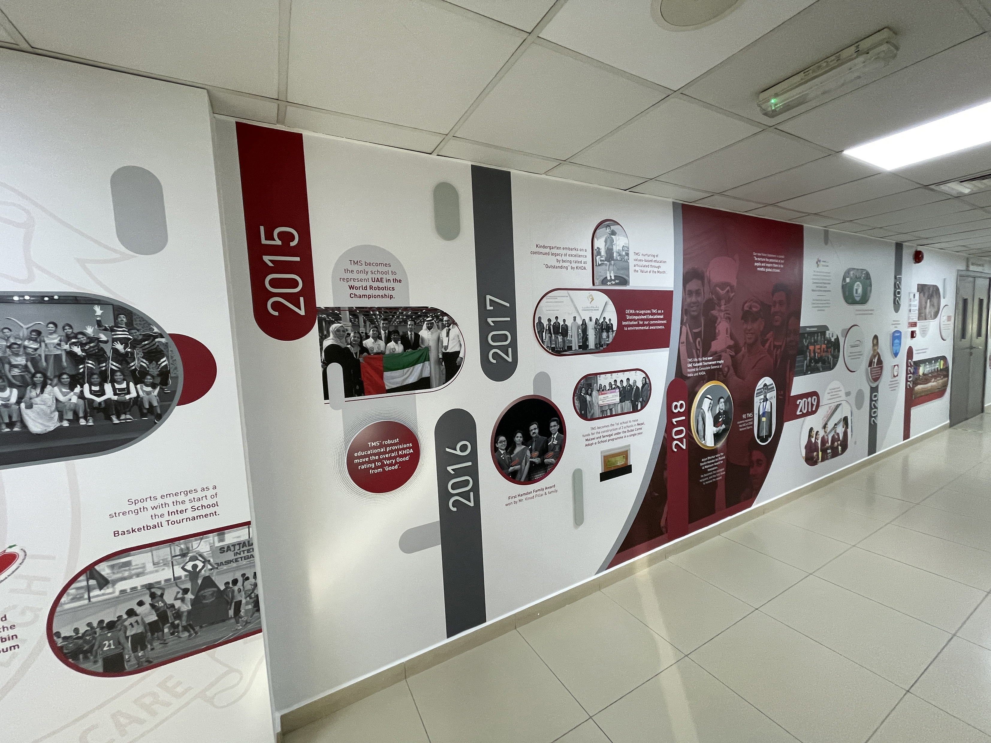 The corridor leading to the auditorium was transformed into a visual corridor of memory and momentum. Larger-than-life imagery, layered timelines and dynamic typography celebrate the school’s journey and its people — past and present. This space becomes more than a passageway; it sets the tone for celebration, performance and collective pride.